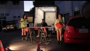 Susanna Battin and Kate Kendall’s piece Gas-for-Water (2018) also addresses oil’s value through trade. The project began on a road trip from Lake Mead in Nevada to Los Angeles during California’s extreme drought. It imagines the plight of “meadmaids,” or mermaids whose livelihood is dependent on the lake, formed in 1936 when the Hoover Dam was completed. Set in a dystopian future where gas is plentiful but fresh water is scarce, the meadmaids exchange one for the other as they journey back to the lake and replenish its holdings. At a performance at the opening and later at Mentryville (the site of the first successful oil strike in California), the artists will dramatize the exchange of water for gas in a choreographed piece, the score of which will be on display in the back windows of the truck gallery, along with a hand-drawn map of oil extraction sites in the LA region. A limited-edition water bottle emblazoned with an intentionally misleading logo stating its contents as “Gasoline” will be available for sale, and the origin story of the meadmaids will be reprinted in the zine that accompanies the exhibition.