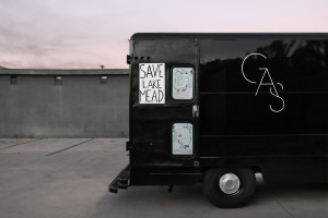 The water bottle is an offshoot of the artists’ larger project for the exhibition Gas-for-Water (2018) that addresses oil’s value through trade. Gas-for-Water began on a road trip from Lake Mead in Nevada to Los Angeles during California’s extreme drought. It imagines the plight of “meadmaids,” or mermaids whose livelihood is dependent on the lake, formed in 1936 when the Hoover Dam was completed. Set in a dystopian future where gas is plentiful but fresh water is scarce, the meadmaids exchange one for the other as they journey back to the lake and replenish its holdings. At a performance at the opening and later at Mentryville (the site of the first successful oil strike in California), the artists dramatize the exchange of water for gas in a choreographed piece, the score of which will be on display in the back windows of the truck gallery, along with a hand-drawn map of oil extraction sites in the LA region.